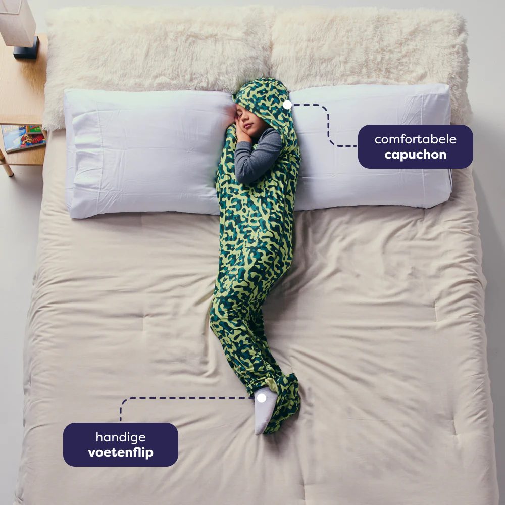 Ja, de slaapcocon is volledig veilig. Het zachte, ademende materiaal geeft alleen lichte druk en rekt in alle richtingen mee. Dankzij de handige voetopening kan je kind zich altijd vrij bewegen, omdraaien of eenvoudig uitstappen. Zo voelt het geborgen, maar nooit beperkend.