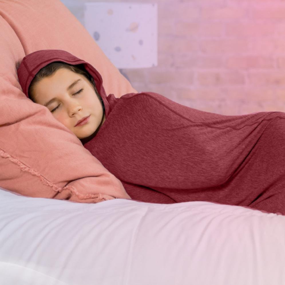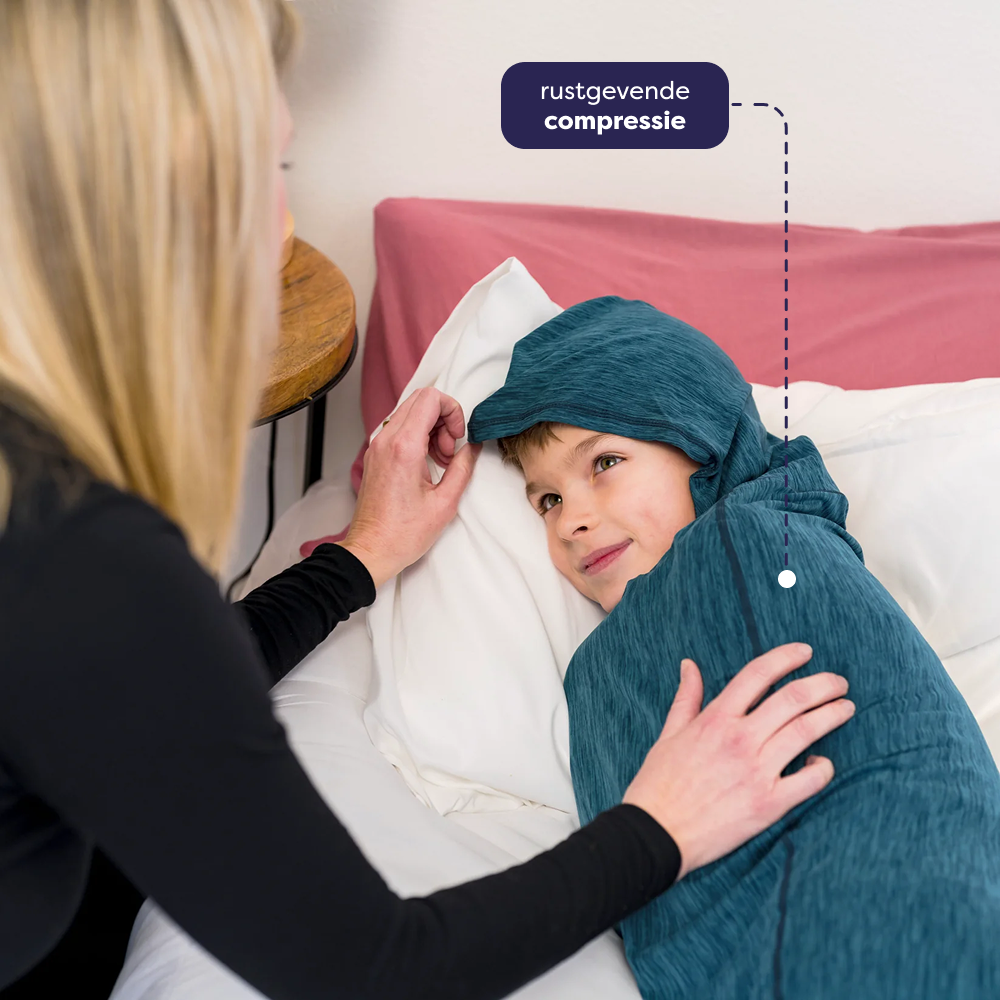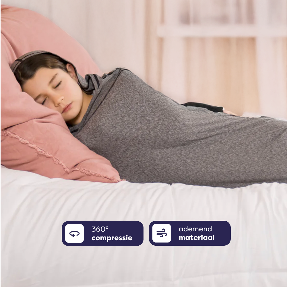 De slaapcocon gebruikt Diepe Druktherapie (DTT): een zachte, constante druk die het zenuwstelsel kalmeert – net als een verzwaringsdeken. Het voelt als een veilige, rustgevende knuffel, waardoor kinderen sneller ontspannen en makkelijker in slaap vallen.